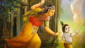 एक बार की बात है कि यशोदा मैया प्रभु श्री कृष्ण के उलाहनों से तंग आ गई और छड़ी लेकर श्री कृष्ण की ओर दौड़ी। जब प्रभु ने अपनी मैया को क्रोध में देखा तो वह अपना बचाव करने के लिए भागने लगे।